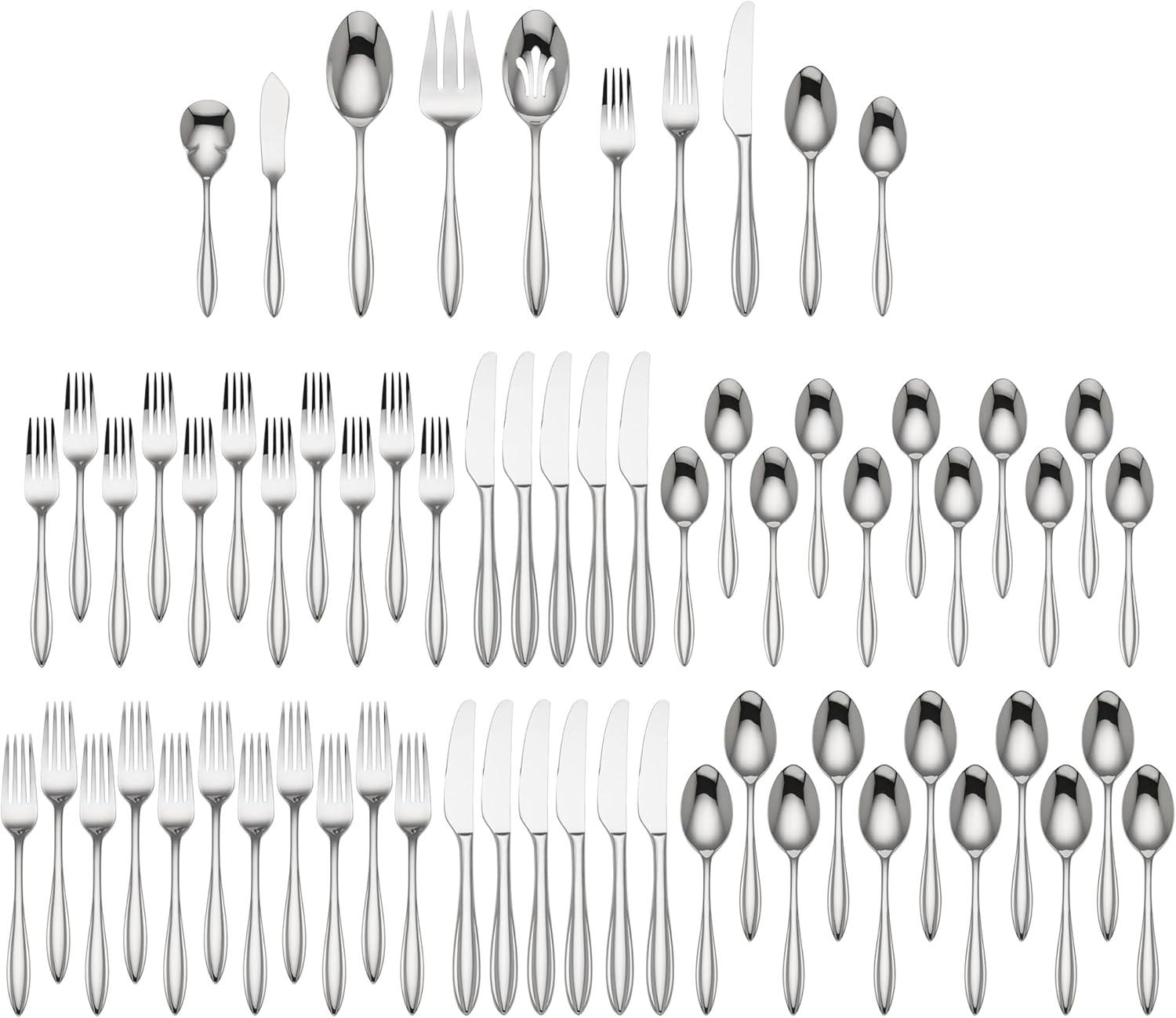 Includes twelve dinner forks, twelve Salad forks, twelve dinner knives, twelve tablespoons, and twelve teaspoons, in addition to a serving spoon, pierced serving Spoon, sugar Spoon, butter knife, and serving Fork.